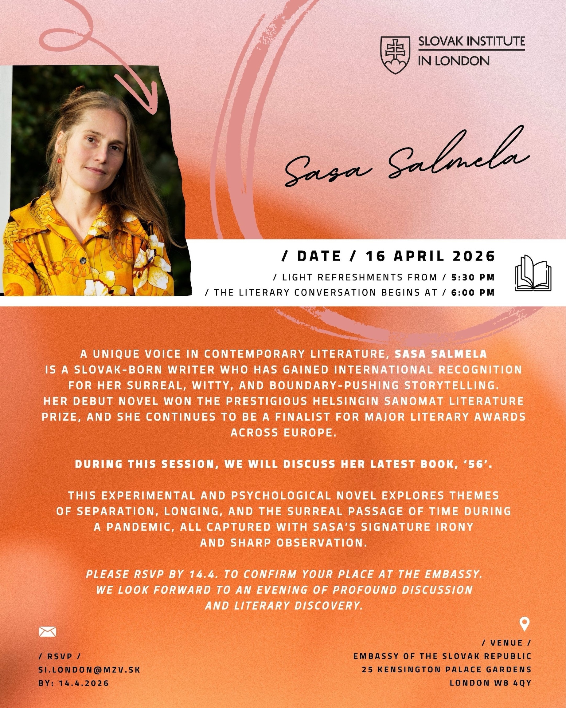 Dávame do pozornosti, že Slovenský inštitút v Londýne pri Slovenskej ambasáde v Londýne organizuje dňa 16.apríla 2026 diskusiu s medzinárodne uznávanou spisovateľkou pôvodom zo Slovenska – Sasa Salmela. Bližšie informácie pre záujemcov ohľadom tejto diskusie,napríklad do kedy a ako si rezervovať miesto, nájdete v letáku tu:
