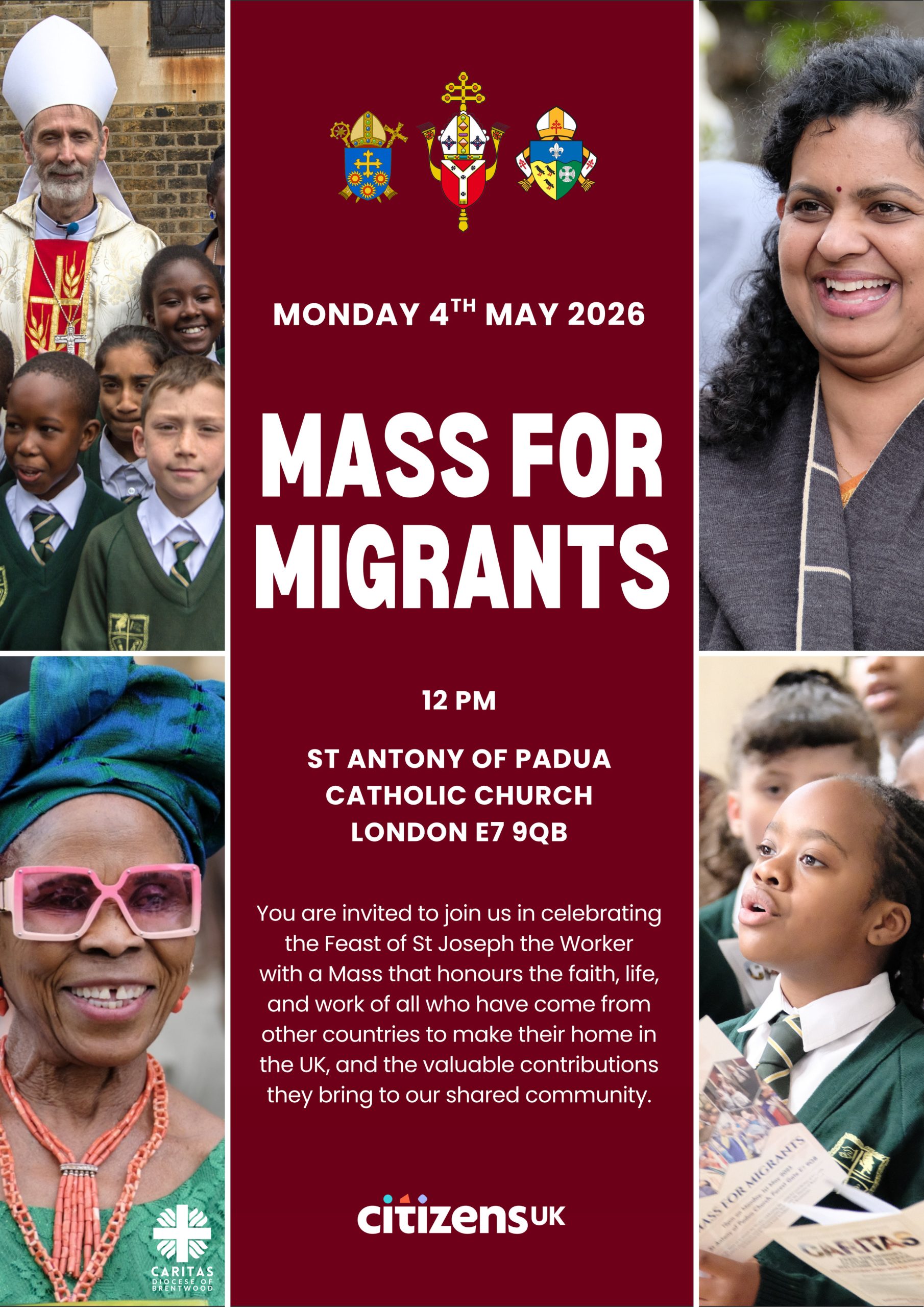 Všetci ste srdečne pozvaní pripojiť sa ku diecézam Brentwood, Southwark a Westminster ku 20tej, každoročnej omši za migrantov. Uskutoční sa na Bank holiday, 4. mája 2026 v katolíckom kostole sv. Antona Paduánskeho. Slávnosť začína o 12.00 hodine procesiou zástav.